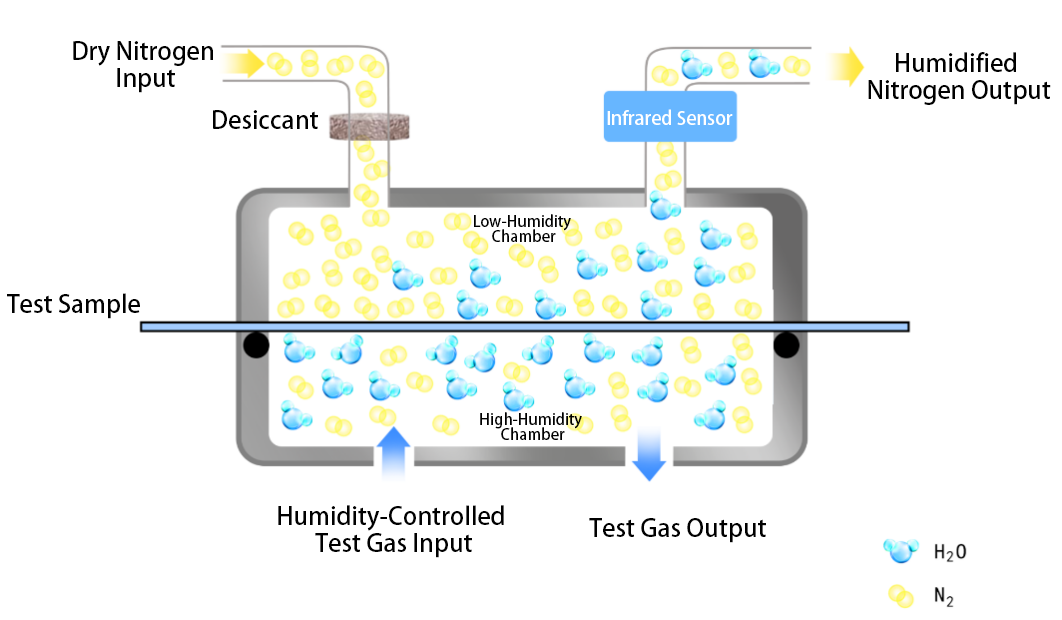 ، ويتم اشتقاق معلمات مثل معدل نفاذية بخار الماء للعينة من الإشارة الكهربائية الناتجة عن المستشعر.